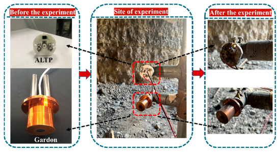 The bomb’s primary shell is composed of steel, with a wall thickness of 2 mm. The main charge column has a diameter of 104 mm and a height of 63 mm. Liquid-solid thermobaric explosive (TBX) serves as the main charge, and combustible ice is integrated to prepare the thermobaric agent; the charge column weighs approximately 1.0 kg. To meticulously evaluate the transient heat flux density of the explosion field produced by this reagent, both the reinforced structure of the atomic layer thermopile sensor (ALTP) and a standard Gardon gauge were employed in field testing (see Figure 11). These instruments were affixed to a steel base, aligned at the same elevation as the charge. The initial testing occurred in a semi-enclosed environment, followed by a test in an open setting. For the semi-enclosed test, the ALTP and Gardon gauge were situated at the entrance of a partially enclosed chamber, 4 m from the detonation core. In the open environment test, the sensor was placed 3 m from the detonation point.