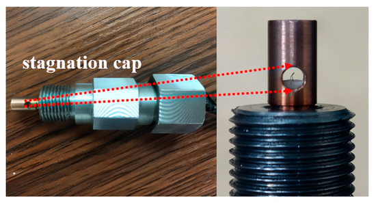 To probe the instantaneous heat flux variations in the explosion field and their determining factors, a tungsten-rhenium thermocouple temperature measuring device with an armored structure was also positioned at the same site. Leveraging prior experience with thermobaric explosive temperature testing, this experiment utilized a 0.08 mm diameter thermocouple wire, noted for its superior response time and impact resistance. The temporal resolution achievable with this setup is as fine as 0.1 ms, as verified by laser pulse testing; the thermocouple is depicted in Figure 12. Due to thermal inertia, the thermocouple cannot precisely gauge the thermal radiation emitted by the bright fireball at the initiation moment. However, its efficacy in measuring high-temperature airflow renders it a powerful tool for capturing the convective heat flux subsequent to the shock wave lag in the explosion field [23]. Previous studies have shown that an increased high-temperature airflow velocity leads to a higher Reynolds coefficient, enhanced heat transfer efficiency, and augmented thermocouple dynamic test performance. This makes the thermocouple apt for the high-speed and high-temperature airflow heat flux testing incited by explosions. Moreover, when the high-temperature airflow direction is orthogonal to the V-shaped plane of the coupling joint, the obtained time constant is minimized [24]. This information guides the positioning of the vent in the stagnation hood relative to the thermocouple wire. In summation, the tungsten-rhenium thermocouple test results accurately depict the convective heat flux alterations of the explosive fireball, supplying a solid basis for ALTP data analysis.