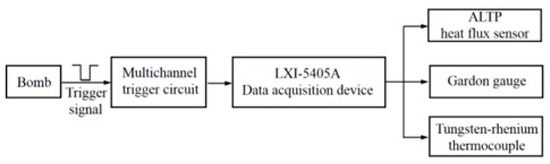 Figure 13 presents the block diagram of the experimental system. To synchronize the starting time of multiple signals, ensuring temporal comparability, a multi-channel synchronous trigger device was employed. Upon receiving a falling edge pulse signal at the detonation moment, this device can synchronously activate the acquisition device. The employed acquisition device, LXI-5405A, supports the simultaneous capture of up to 16 signals with a maximum acquisition frequency of 1 MSa/s. Given that the fastest response of the ALTP is 10 µs, as seen in Figure 4a, the sampling rate for each channel was set at 200 KSa/s.