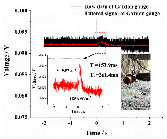 Utilizing high-resolution techniques, ALTP’s heat flux-temporal correlation curves were obtained, as illustrated in Figure 14. Positioned 4 m from the detonation center, the first wave of ALTP is detected 16 µs after the explosion, followed by a rapid decline in the observed peak and the emergence of a second wave after a 26 ms interval. The corresponding heat flux values for these peaks are 202 kW/m2 and 136 kW/m2. Figure 15 shows the Gardon gauge-collected heat flux signal under the same conditions. Compared to ALTP, the Gardon gauge displays (1) diminished sensitivity and significant signal noise, and (2) a response time on the order of 100 milliseconds and rise time Td and descent time Td of 153.9 ms and 261.4 ms, respectively. Its suboptimal dynamic characteristics prevent the Gardon gauge from effectively detecting the dual peak phenomenon, unlike ALTP.