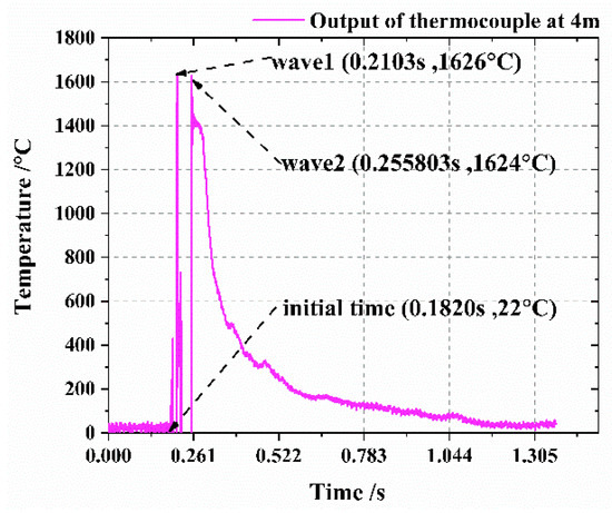 Figure 16 reveals the results of the armor-tungsten-rhenium thermocouple test. The curve shows a response beginning at 0.1820 s, with an initial temperature of 22 °C. Wave 1 is reached at 0.2103 s, peaking at 1626 °C, followed by rapid temperature decay. Wave 2 is registered at 0.2558 s, with a temperature of 1624 °C. The 28.3 ms time interval between wave 1 and the initial state correlates with the wave 2 moment in Figure 14, confirming that ALTP wave 2 mainly stems from high-temperature airflow following the explosion shock wave. Wave 2 of the thermocouple is hypothesized to be a result of impact in a semi-enclosed environment and the reflection of high-temperature airflow.