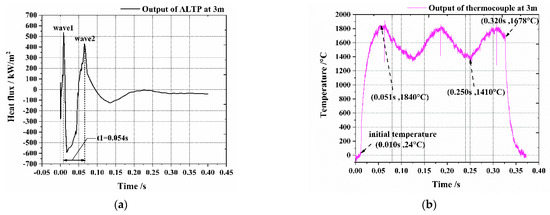 Figure 17a illustrates the ALTP test results at a distance of 3 m from the detonation center, exhibiting two distinct wave peaks, analogous to Figure 9a. The explosion heat flux measurement substantially increased, attaining 535 kW/m2 for wave 1, attributable to the decreased testing distance and an open environment. Furthermore, the time interval between waves 1 and 2 extended to 54 ms. To validate this observation, the utilization of an armored tungsten-rhenium thermocouple is imperative. Figure 17b demonstrates the test results from the armored tungsten-rhenium thermocouple, disclosing a peak temperature of 1840 °C at 51 ms, approximately aligning with the wave 2 moment (54 ms) in Figure 17a. This alignment corroborates that ALTP-measured wave 2 predominantly emanated from high-temperature airflow subsequent to the blast wave. Concurrent thermal radiation from the fireball pervaded the entire explosion. Notably, as the fireball expanded and developed, it encompassed the sensors in both experiments. Therefore, heat convection primarily governed the heat exchange with the sensors, while radiation played a secondary role. The temperature then oscillated between 1400 °C and 1800 °C for around 463 ms before reverting to ambient levels.