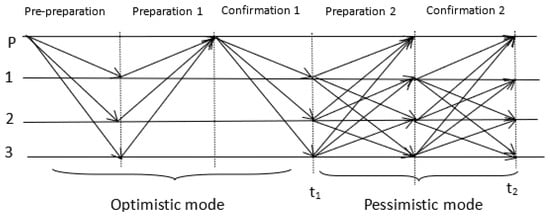 In view of the general situation, the traditional PBFT algorithm is rarely attacked by malicious nodes in the consensus, and the Byzantine consensus algorithm will only work when malicious nodes interfere with the consensus process. Therefore, the three-stage communication process of the PBFT algorithm can be simplified, and the optimization idea of a speculative algorithm can be used to divide the PBFT algorithm into two modes. (1) In the optimistic mode, nodes behave without delay and hardly apply any protection against malicious nodes. The emphasis on consensus efficiency makes the algorithm in the optimistic mode competitive with the centralized system in terms of speed. (2) Pessimistic mode, the optimistic mode triggered by timeout and security measures against malicious nodes are added. The only goal is to successfully reach consensus even if there are malicious nodes.