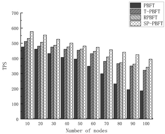 Throughput is defined as the number of transactions that the system processes per request in a unit of time. The higher the throughput, the greater the number of transactions that will be processed. Set the four consensus algorithms PBFT, T-PBFT, RPBFT, and SP-PBFT to complete the same number of transactions in 10, 20, 30, 40, 50, 60, 70, 80, 90 and 100 nodes, respectively, and the number of transactions completed per second will be calculated. TPS (Transaction Per Second) represents the system throughput, and the calculation formula is given in (2).