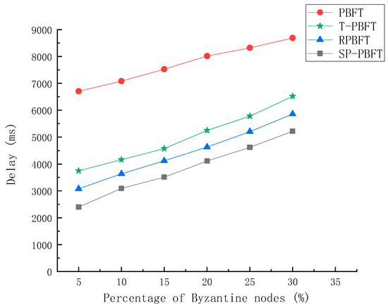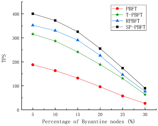 The experimental results show that the four algorithms have certain fault tolerance. When the number of Byzantine nodes is 33, it does not exceed 1/3 of the number of nodes, and blocks can be normally generated. But when the number of Byzantine nodes is 34, it exceeds 1/3 of the number of nodes, so the block cannot be successfully generated. It can be seen from Figure 8 that the delay of the four algorithms becomes longer with the increase in the number of Byzantine nodes, but the delay of the SP-PBFT algorithm is lower than that of the other three algorithms. It can be seen in Figure 9 that the throughput of the algorithm is lower when the number of Byzantine nodes is larger, but the throughput of the SP-PBFT algorithm is always higher than that of the other three algorithms, so the SP-PBFT algorithm is better.