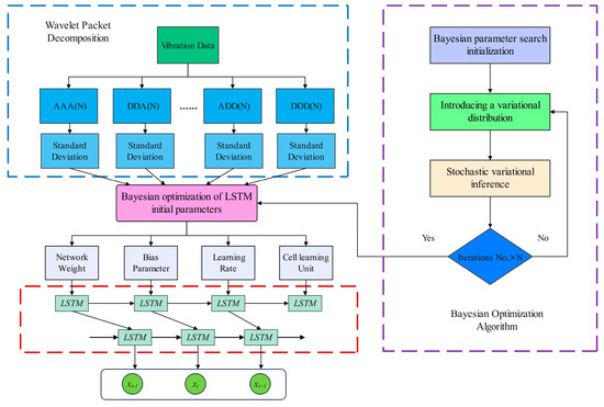 In summary, the proposed picks wear state recognition model is shown in Figure 4, and the process of the picks wear state recognition model based on wavelet packet decomposition and Bayesian optimization of LSTM is as follows: