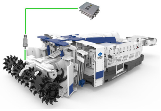 In the experiment, we continued to adopt the strategy of centrally changing the picks. By statistically measuring the wear volume of the picks before each shift, and calculating the overall wear coefficient of the picks on drum cutting according to Formula (9), it was found that if the picks were not replaced for 2 days, the overall wear coefficient could reach 0.3. If extended to more than 3 days, the wear coefficient could reach 0.5. This preliminarily proved that delaying the replacement of picks can accelerate their wear. Therefore, the field collected the X, Y, and Z directional vibration acceleration of the cutting drum of the bolter miner immediately after replacing the picks, and 2 and 3 days later, respectively representing slight wear, moderate wear, and severe wear levels. The vibration sensor location is shown in Figure 5.