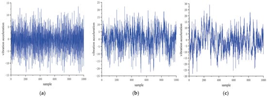 During the field tests, 2 s of X, Y, and Z directional vibration data were recorded every minute under each working condition, ensuring the data collection was in a stable state. In total, 100 sets of data were recorded under each working condition, with a total of two detection tests conducted, forming a total of 600 sets of characteristic data. The collected Y-directional raw vibration data are shown in Figure 6.
