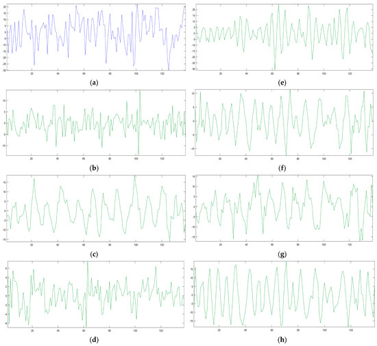 Wavelet packet decomposition diagram of Y-directional vibration signals for picks with moderate wear. (a) Coefficients of Packet (3, 0), (b) Coefficients of Packet (3, 1), (c) Coefficients of Packet (3, 2), (d) Coefficients of Packet (3, 3), (e) Coefficients of Packet (3, 4), (f) Coefficients of Packet (3, 5), (g) Coefficients of Packet (3, 6), (h) Coefficients of Packet (3, 7).
