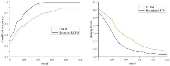 To verify the recognition effect of the Bayesian-LSTM network, a deep LSTM network is chosen for comparison analysis. In the deep LSTM network, the settings of hyperparameters such as the learning rate and the number of hidden layers are consistent. The training results of the two networks are shown in Figure 8.