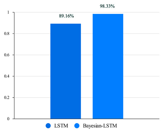 As shown in Figure 8, with the increase in iterations, the Bayesian-LSTM network decreases very quickly. Compared to the standard LSTM network, it achieves a higher accuracy at a faster rate and the accuracy at each measurement point is higher than that of the standard LSTM. To quantify the accuracy of the two prediction models, a comparison of their accuracy rates is shown in Figure 9.