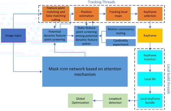 ORB-SLAM2 is an outstanding work based on the feature point method, and the system is highly applicable to monocular cameras, binocular cameras and RGB-D depth cameras. ORB-SLAM2 is composed of three threads, which are the tracking thread, local map building thread and loopback detection thread, through which the robustness of tracking keyframes, trajectory construction and map building performance is improved. Furthermore, the SLAM system in this paper is improved on the basis of these three threads. The SLAM system structure of this article is shown in Figure 1. First, the SLAM system in this paper proposes an image mismatching algorithm that incorporates grid motion statistics with adaptive margins. Second, a semantic segmentation module is added to the tracking thread, in which the semantic segmentation module adopts the Mask R-CNN network based on the attention mechanism, through which the dynamic objects in the scene are segmented out and the preliminary estimation of the bit position is performed at the same time. Finally, in order to enhance the robustness of the system, motion constraints and chi-square tests are used to re-add the static feature points on the dynamic objects, and the estimation of the camera position is corrected.