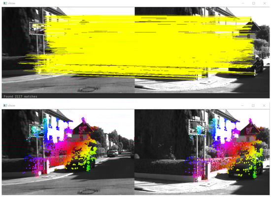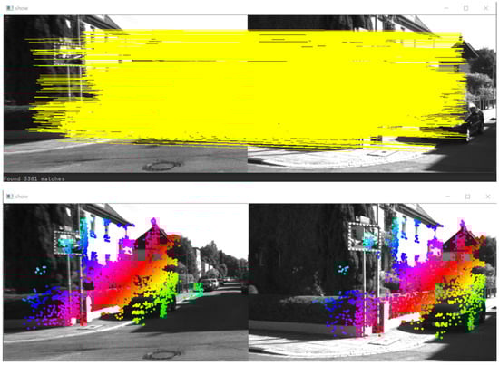 From the distance metric, , it can be seen that the larger the (number of feature matching pairs in the grid), the larger the value of . A larger also indicates a greater distance between two binomial distributions of possible events, i.e., a greater distinction between correct and incorrect matches. This method is equivalent to increasing the score, , while reducing the number of cycles in the main body of the algorithm, i.e., increasing the value of . The value of increases with the increase in , which also allows better differentiation between correct and incorrect matches. The Figure 3 and Figure 4 show the comparison of the operation results of the original GMS algorithm and the improved GMS in this paper. This paper’s algorithm has a higher number of accurate matching pairs compared to the GMS algorithm.