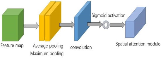 The spatial attention module of CBAM focuses on modeling the correlation between channels and space by performing a convolution operation on the feature map and then using the global information of the convolved feature map dynamically. One of the specific operations is shown below, where the input image is first subjected to maximum pooling and average pooling. Finally, the convolution operation is performed and Sigmoid activation is processed to generate a matrix of size , the and the are represented as the height and width of the feature map. Figure 7 illustrates the specific structure of the spatial attention module of CBAM.