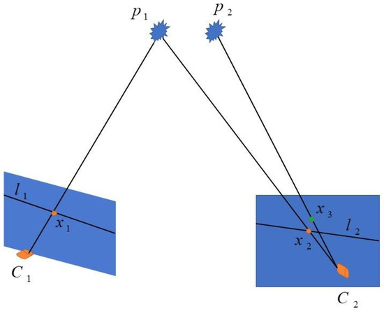 As shown in Figure 9, and are the optical center positions of the camera at two adjacent moments, and . Point is a feature point on the potential dynamic object, when is a static feature point, the pixel coordinates of this static feature point on the two imaging planes are and , respectively, and these two coordinates fall on the epipolar lines, and , of the two imaging planes, respectively. If is a dynamic feature point, at the moment, has moved to the position, the pixel coordinate in the imaging plane is . The expression of pole line is shown in Equation (10), where pole line satisfies the expression of Equation (11).