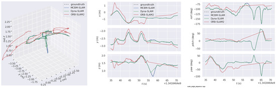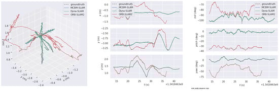 The TUM-RGBD dataset, published by TUM’s Computer Vision Lab, contains texture-rich office scenes, some of which contain many objects that are constantly moving. The SLAM algorithm in this study involves a great deal of dynamic de-objects, so the sequences containing dynamic elements are chosen for the experiments in this paper: s_static, w_halfsphere, w_static and w_xyz. In the TUM-RGBD dataset, the main dynamic objects are the office personnel in the scene. The w_static in the sequence is a low dynamic sequence, and the other three are high dynamic sequences. The letter “s” stands for sitting and “w” stands for standing, and the word after the “_” denotes the camera movement mode in the sequence. It can be seen from Figure 10 that the SLAM in this paper can eliminate the effect of dynamic objects well under the office dynamic sequence.