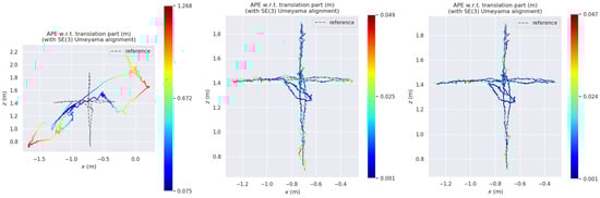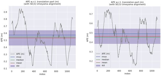 where represents the ATE of frame , represents the bit pose estimated by the algorithm, represents the real bit pose, represents the time interval and represents the similar transformation matrix from the estimated bit pose to the real bit pose.