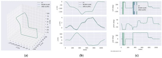 Comparison of trajectories on the KITTI07 sequence. (a) Comparison chart with real trajectory. (b) Comparison results in xyz direction. (c) Comparison results in the rpy direction.