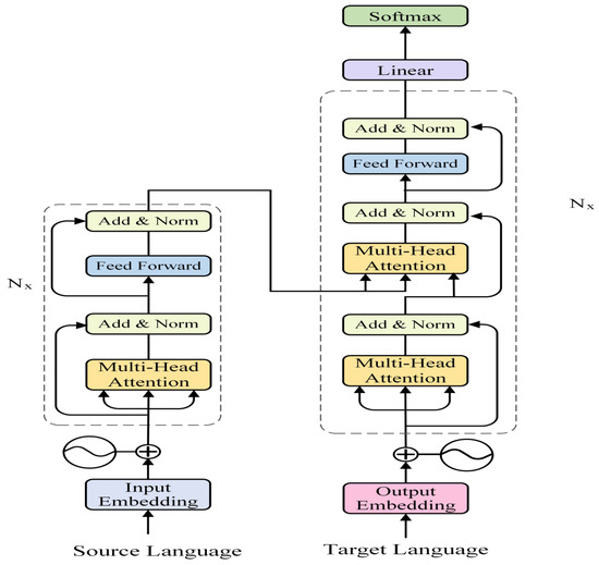 In this section, no changes have been made to the encoder of the baseline model, which is composed of N = 6 independent layers stacked together. Each encoder contains two sub-layers: multi-head self-attention mechanism and a feedforward neural network. Each sub-layer is followed by a residual network and a normalization layer. The encoder takes the source language vectors processed by the embedding layer as the input for the multi-head self-attention mechanism and performs attention calculation and normalization processing on it (Equation (4)). Finally, the output of the encoder is obtained through the feedforward neural network (Equation (5)).
