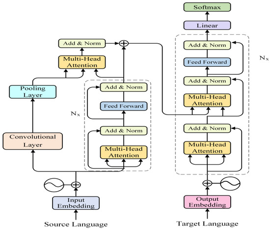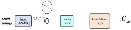 Low-resource neural machine translation has long been an area of interest in natural language processing, and many researchers have made significant efforts to address this problem. Common improvement methods include data augmentation, introducing prior knowledge, and structural improvements. Tonja used monolingual source-side data to improve low-resource neural machine translation and achieved significant results on the Wolaytta–English corpus, further fine-tuning the best-performing self-learning model which resulted in +1.2 and +0.6 BLEU score improvements for Wolaytta–English and English–Wolaytta translations, respectively [4]. Mahsuli, MM proposed a method to model the length of a target (translated) sentence given the source sentence using a deep recurrent neural structure—and apply it to the decoder side of neural machine translation systems to generate translation sentences with appropriate lengths which have a better quality [5]. Pham, NL; Nguyen, V; and Pham, TV used back-translation to enhance the parallel database of English–Vietnamese machine translation, significantly improving the translation quality of the model [6]. Laskar, SR improved English–Assamese machine translation through pre-training models, and the best MNMT model, Transformer (transliteration-based phrase-augmentation), attained scores of +0.58, +1.86 (BLEU) [7]. Park, YH enhanced low-resource neural machine translation data through EvalNet and the NMT systems for English–Korean and English–Myanmar, built with the guidance of EvalNet, and achieved 0.1~0.9 gains in BLEU scores [8]. While these methods have achieved good results, they often require significant time and cost in the data preprocessing stage and have certain drawbacks. Dhar, P introduced bilingual dictionaries to improve Sinhala–English, Tamil–English, and Sinhala–Tamil translation and introduced a weighted mechanism based on small-scale bilingual dictionaries to improve the measurement of semantic similarity between sentences and documents [9]. Gong, LC achieved good results on several low-resource datasets by guiding self-attention with syntactic graphs [10]. Hlaing, ZZ added an additional encoder to the transformer model to introduce part-of-speech tagging, improving Thai-to-Myanmar, Myanmar-to-English, and Thai-to-English translation, outperforming such models developed through the existing Thai POS tagger in terms of BLEU scores (+0.13) and chrF scores (+0.47) for Thai-to-Myanmar, and BLEU scores (+0.75) and chrF scores (+0.72) for Myanmar-to-Thai translation pairs [11]. Considering that convolutional neural networks can extract feature information from sentences, this paper integrates a convolutional neural network as a feature extraction layer into the Transformer model. This method can introduce feature information into the Transformer model without additional processing of the corpus, improving the translation quality of the Transformer model while also saving research time and costs. The main contributions of this article are as follows: