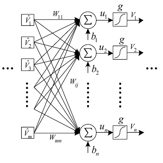In Figure 1, represent the inputs, which are also the outputs of the previous layer. Wij represents the weight value from neuron i in the previous layer to neuron j in the current layer. b1~bn represent biases. u1~un represent the outputs of multiply-accumulate (MAC), which can be obtained as follows: