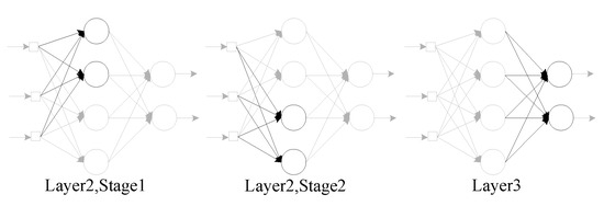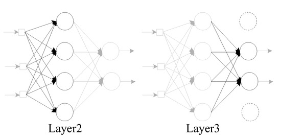 Since the layer with maximum neurons is selected as the multiplexing layer in the traditional layer multiplexing method, the resource consumption of which is still related to the concrete topology, so the application of the method is limited. In addition, the layer multiplexing method has low resource utilization when the neural number varies largely in different layers. For example, in Figure 3, a neural network with a topology of 3-4-2 is calculated according to the traditional multiplexing method, and the part of the neural network that is executing calculations is represented by solid lines, others are represented by shaded lines. The layer number in the figure represents the layer that is executing calculations. The calculation resources are configured according to the second layer, which has the largest neuron number of four, and it can be observed that two NCUs are idle in the calculation of the last layer, which causes the low resource utilization.