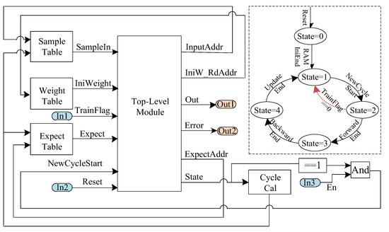 At the top-level module, the samples, initial weights, and expectations are inputs from external sources, which can be acquired through the retrieval of corresponding tables. The inner modules generate the addresses of these tables, which are then output from the top-level module. The “TrainFlag” signal is utilized to determine whether to execute the interface-only algorithm or the entire training process. This determination is manifested through the state machine depicted within the dashed rectangle, when the signal on the arrow is valid, the state machine performs the corresponding transition. If “TrainFlag” is zero, the state machine will transition directly to “State = 1” upon completion of “State = 2”; otherwise, it will proceed to “State = 3” and carry out the entire calculation. (Refer to Table 1 for a description of the state machine.)
