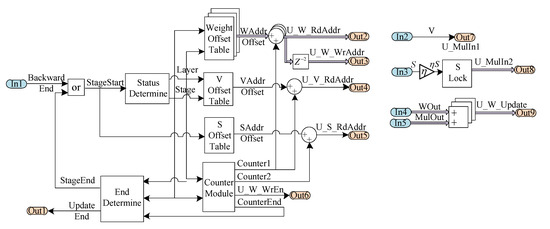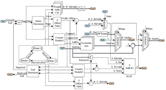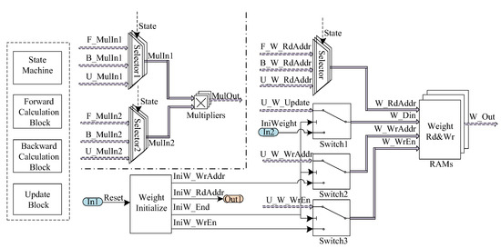 To make the design clearer, the forward calculation phase, backward calculation phase, and update phase correspond to three independent modules, namely, forward calculation block, backward calculation block, and update block. In all three phases, multipliers and weights are utilized and multiplexed to minimize resource usage. The interconnections between the multipliers, weight storage, and other blocks can be found in Figure 6.