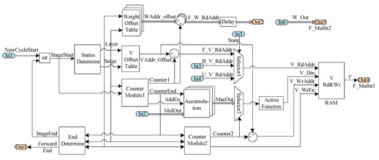The start signal of the block derives from the end signal of the previous stage, or from the external start signal of the new cycle for the first stage of the first layer. When the start signal arrives, the status of layers and stages will be updated first. A counter named “Counter1” will start at the same time, which increases from 0 to Ni−1. The address offset of weight and output V can be obtained by looking up the corresponding offset table according to the current status of layers and stages. The address of weight and V can be then obtained by adding the counter and the offset value.