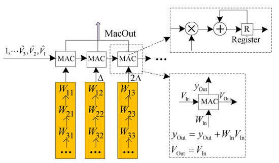The architecture illustrated in Figure 8 can be regarded as a “folded” systolic array [22], which exhibits similarity to a conventional systolic array when the Multiply-Accumulate units (MACs) of the architecture are vertically unfolded. The MAC is comprised of the multipliers depicted in Figure 6 and the accumulation module within the forward calculation block. The input traverses through the MACs sequentially, effectively supporting the storage of a single value V in one RAM for each clock cycle.
