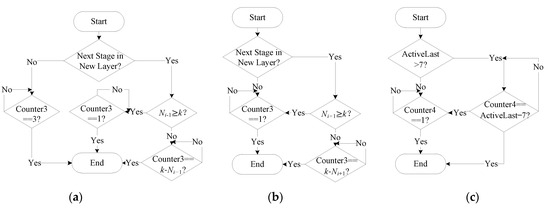 Unlike in forward calculation phases, the “StageEnd” signal in the last stage of the last layer cannot be directly used as the end signal of backward calculation phases. The end time determination of the backward calculation phase is shown in Figure 9c, where “Counter4” starts as the stage end and ends as the backward calculation phase ended. The “StageEnd” signal in the backward calculation phase is the same moment as the first sensitivity value stored in RAM, but the access of V may not end at this moment as the value of V is used to calculate the derivative of the activation function in (8). Therefore, if the backward calculation phase is the end at this moment, the access of V may be conflicted in the backward calculation and update phases. Since the “StageEnd” signal is seven clock cycles later than the first access of V, the end signal of the backward calculation phases can be set to the “StageEnd” signal if the “ActiveLast” is less than or equal to seven, where the “ActiveLast” is the neuron number active in the calculation in the last stage of the last layer. Whereas, the end signal of backward calculation phases should be ActiveNum-7 cycles later than the “StageEnd” signal if the “ActiveLast” is more than seven.