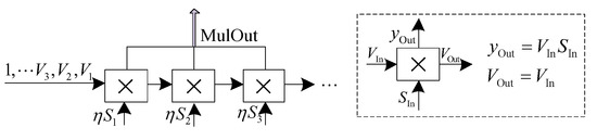 Since the value of V and S are all stored in the RAMs and only one value is accessed in one clock cycle, the value of S is locked in the registers after every access to support the parallel multiplication, and the constant multiplication in (6) is performed after the access of S. The signal flow of multiplication is shown in Figure 12.