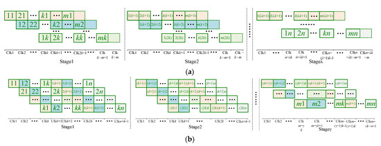 By employing the proposed method, it is possible to decouple the topology from the resources and enhance their utilization. For example, if the case depicted in Figure 3 is processed using the proposed method and the number of NCUs is set to two, the calculation process for this is demonstrated in Figure 4. The stage number in the figure represents the different executing stage of one layer of the proposed method.