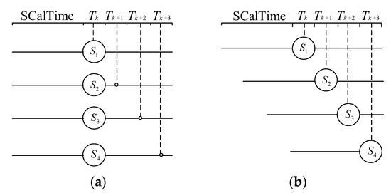 “Counter2” starts after the “Counter1” ending for a few cycles, which is not only served as the selection signal of “Selector2” but also added with the offset address of V to constitute the write address. The end signal of “Counter1” is also input into the “End Determine” module to determine the end time of both stages and the forward calculation phases. Intuitively, the calculation of each stage should not end until the storage of V is finished. However, the end time can be advanced because the storage can be executed simultaneously with the calculation in the next stage. The determination of the end time should avoid the storage conflict in different stages, which means the storage of output in the current stage should be finished before starting the storage in the next stage. Therefore, the end time in the forward calculation phase is shown in Figure 9a.