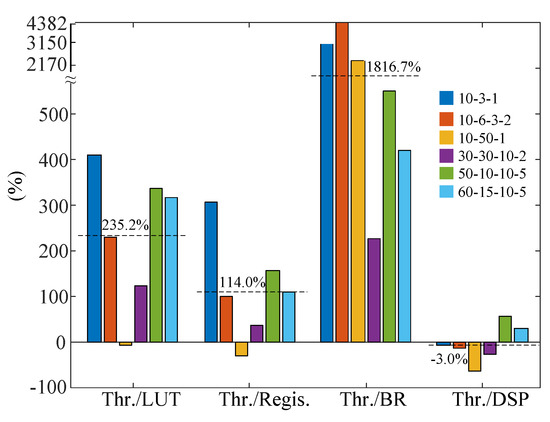 In Table 6, compared to the method in [13], the proposed method consumes an average of 21.3% fewer calculation cycles due to the compact timing arrangement. The maximum frequency of the proposed method is about 160 M, while the value of the method in [13] is 200 M, so the maximum frequency of the proposed method is 20% lower. Therefore, it can be inferred that the two methods have an equivalent index of throughput/resource, which reflects that the resource utilization of the two methods is also equivalent, indicating that the layer multiplexing algorithm can be seen as a special case of the proposed method. However, the proposed method is more flexible as the number of NCUs is configurable, the resource consumption can further decrease, and resource utilization can further increase as the number of NCUs decreases.
