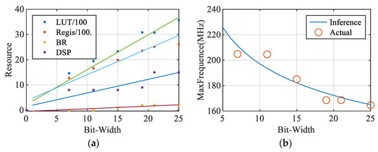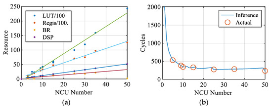 The resource consumption of different NCU numbers in Table 4 and the corresponding fitting curves are shown in Figure 20a, which is consistent with Equation (18). The maximum frequency of different NCU numbers and the inferred value of Equation (19) are shown in Figure 20b, which verifies Equation (19).