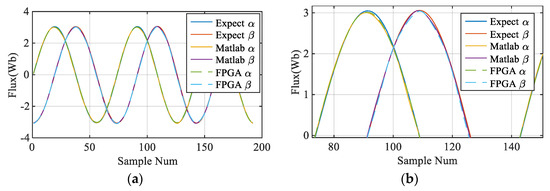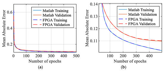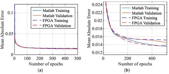 The proposed method is expected to be further used in some practical control applications, such as the motor drive. Therefore, a flux training example is used to verify the proposed method. The data of flux, voltage, and current in a motor drive system is used as the learning dataset, in which the voltage and current are used as the input and the flux is used as the output. The dataset has more than 1000 samples, which are divided into training, validation, and generalization sets by 50%, 20%, and 30%. The neural network topology is 8-5-5-2 [32] and the data bit-width of the proposed method is selected as [1,7,18]. There are eight inputs because not only the voltage and current in the α and β axis of the contemporary cycle are used as inputs, but the values of the previous cycle are also applied as inputs. Given the same initial weight value, the training and validation error curve of the proposed method implemented on FPGA and the curves of the neural network trained in Matlab are compared in Figure 24a, and Figure 24b is the partial enlargement of Figure 24a.