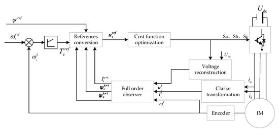 The induction motor (IM) has been widely used in electric drive systems due to the advantages of easy maintenance and high reliability [1,2,3,4]. Vector control (VC) and direct torque control (DTC) are currently the most widely used high-performance control methods in the industry [5,6,7,8]. VC has good dynamic performance, but the system response is slow. DTC can improve the system response speed but tends to cause flux waveform distortion and large torque ripple [9]. To solve the shortcomings of VC and DTC, model predictive control (MPC) has attracted considerable attention to improving the performance of motor control systems [10,11,12,13].