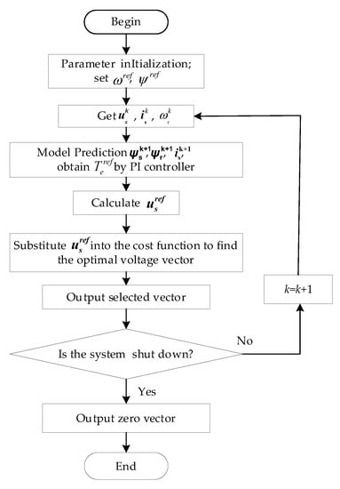 The flow chart of MPVC is shown in Figure 2. The control procedure is implemented at a constant period. In every control period, the actual voltage, current, and speed are obtained and fed back to the prediction model to obtain the predicted system status, i.e., , , and . Then calculate with the system status prediction and the required values of and . By exploring the candidate vectors, the optimal one with respect to the cost function can be found. Additionally, the optimal voltage vector is carried on the inverter to change the output AC power, then the motor can be controlled. If the system is not shut down or interrupted, this control cycle repeats at a constant period.