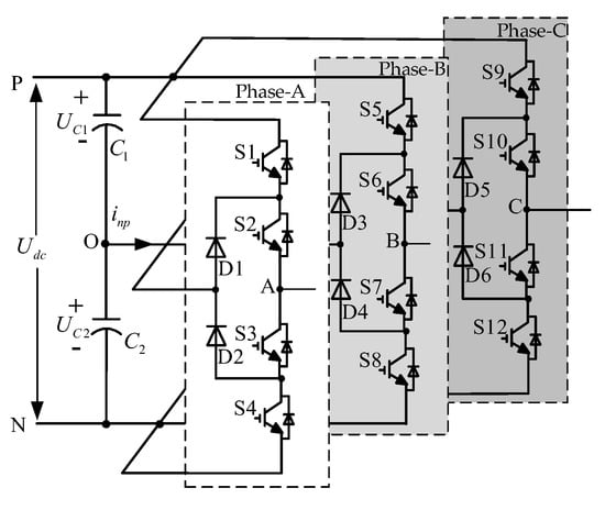 The topology of the 3L-NPC inverter is shown in Figure 3. Compared to the two-level inverter, the 3L-NPC inverter can output medium and small vectors, but it also faces the problem of the neutral point voltage deviation caused by the inflow and outflow of the neutral point current on the DC link capacitor. The expression of the neutral point current of the 3L-NPC inverter is: