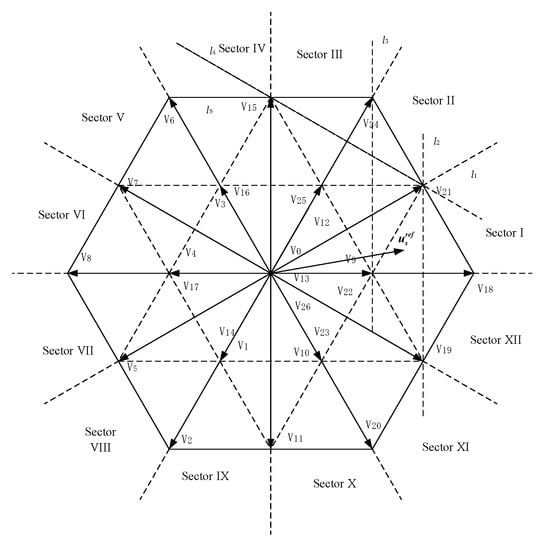 As shown in Figure 4, the output voltage vector of the inverter is V21. For example, according to the constraints of the inverter, the vector V21 allowed to arrive at the next moment is one of V12, V18, V21, V22, V24. When the reference voltage vector is in Sector I, and it is below the vertical bisector l1 of V18 and V24. Obviously, is closer to V18 other than V24, and it is closer to V22 other than V12, so V12 and V24 can be excluded, and the candidate voltage vectors can only be selected from V18, V21, and V22. Similarly, when is in sector II, V18 and V22 can be excluded, and V12, V21 and V24 are the candidate vectors. The candidate voltage vectors at the next time are determined according to the location of the . The above analysis shows that the number of candidate voltage vectors can be reduced from 27 to 1~3. In addition, the vector preselection table is constructed for the 6 typical basic vectors in sector I, as shown in Table 1. Selection of candidate vectors for other sectors can be obtained through a simple sector transformation.