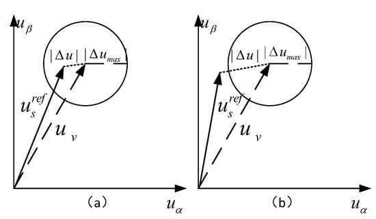 Figure 5 shows the optimal voltage vector selection mechanism with the boundary circle limit. First, the vertex of the output voltage vector of the inverter at the present moment is taken as the circle center, then the preset maximum voltage deviation is taken as the radius to construct the boundary circle. Equation (10) predicts the reference voltage vector at the next moment and then judges whether is located in the boundary circle. When the error between and the present-voltage vector is not greater than , the voltage vector error at this time is considered to be small enough. Then the present switching state is continued to be selected without change to reduce the switching frequency. When is greater than , the error is considered to be large enough, the candidate voltage vectors should be selected according to the vector preselection table, and the optimal voltage vector should be found by enumeration. The physical meaning of in this algorithm is the tolerance degree of the voltage control deviation, so the complicated tuning of the weight coefficient can be waived by simply and intuitively adjusting the size of . The simulation verifies that one good option of is one-third of the length of the large vector, which can reduce the switching frequency and ensure the control performance.
