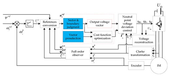 Figure 6 shows the diagram of the proposed control algorithm BLMPVC. The neutral point voltage deviation control strategy adopts hysteresis control. When small vectors are selected in the voltage vector selection process, the predictive deviation of the neutral point voltage predictive deviation at the next moment is predicted by Equation (14). When is no larger than the preset hysteresis width h, neutral point voltage deviation is not carried out, which can reduce the switching frequency further. When the predicted is larger than h, the deviation of is considered to be large. Then, make the inverter output a small vector to reduce the deviation of the neutral point voltage. Although each voltage vector can use a small vector to balance the neutral point voltage deviation, the zero vectors V0 and V26 may make the switch state change between 0 and 2, resulting in a high voltage pulse, which tends to cause the motor winding corrosion and shorten the life of the motor. Therefore, when the inverter outputs zero vectors V0 and V26, the controller should not implement the neutral point voltage deviation control strategy.