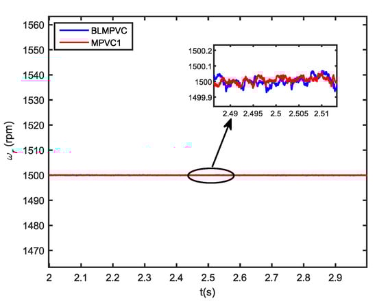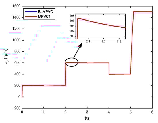 Figure 13 shows the comparison between the two control methods’ start-up to rated speed with no load, and Figure 14 shows the comparison of the two control methods’ start-up to rated speed with full load. It can be seen that the start-up time of both control methods can be maintained at a very high level. The proposed control method BLMPVC can speed up from 0 to 1500 rpm in 0.1 s with no load. Even if the starting speed is slightly reduced at full load, the control system can also start from 0 to 1500 rpm in 0.25 s. In addition, the overshoot of no-load starting is approximately 15 rpm, only at the rate of 1% overshoot, and the overshoot of full-load start is much less, only about 3 rpm.