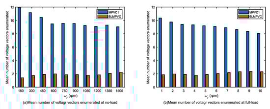 As shown in Figure 7, the control performance of BLMPVC can reach the same level as MPVC1, both of which can achieve good control effects. Figure 8 shows the speed comparison between the two methods. Additionally, it can be seen that the speed is almost the same. Figure 9 shows the torque comparison between these two methods. It can be found that the maximum torque ripple of the two methods is about 0.5 N·m, which can meet the overall control requirements well. Further analysis shows that the torque standard deviation of MPVC1 is 0.1648, and the torque standard deviation of BLMPVC is 0.1657 in 2~3 s, which is very close. Figure 10 shows the mean number of voltage vectors enumerated by each control period under no-load and full-load conditions at different speeds with these two control methods. When the motor runs at no load, it can be seen from Figure 10a the enumerating voltage vector of BLMPVC is at most 24.89% of MPVC1 and at least 11.83% of MPVC1 at different speeds. For all the tested speed conditions from 150 rpm to 1500 rpm, the average enumeration vector number of MPVC1 is 9.89, and the average enumeration vector number of BLMPVC is 1.88, which is only 19. 04% of MPVC1. At full load, scenes remain the same. As shown in Figure 10b, the number of voltage vector enumerations with BLMPVC can reduce to 28.66% of that with MPVC1, and even to 17.99% at the speed of 150 rpm, and the average number of enumerations decreases from 9.11 with MPVC1 to 2.07 with BLMPVC, which is only 22.68% of MPVC1. This greatly reduces the calculation cost of the control system and can improve real-time control.