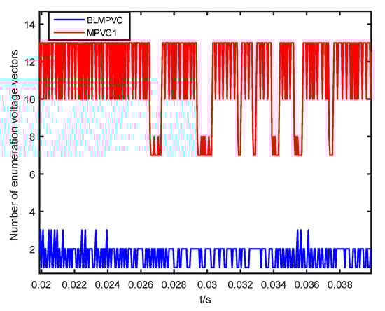 As shown in Figure 15, the number of candidate voltage vectors involved in the enumeration is very different between these two methods. MPVC1 needs to enumerate 5~13 voltage vectors in the control process, but BLMPVC only needs to enumerate 1~3 voltage vectors, which can greatly reduce the calculation amount and improve the real-time performance of the control system.