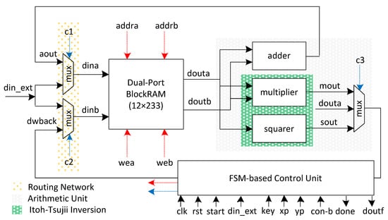 The proposed ECPM accelerator architecture to implement Algorithm 1 is shown in Figure 1. It comprises a memory unit, a routing network, an arithmetic unit, and a control block. In addition to these critical blocks, the controller unit takes eight inputs and produces two outputs. The clk, rst, start, and din_ext are one-bit input signals. The key length is shown with m bits. x and y are the coordinates of initial point P (i.e., , and ). Similarly, con-b represents the curve constant. Moreover, done is a one-bit output signal while doutf is an m-bit output. The start signal specifies when the ECPM operation is needed to initiate the computation. The din_ext signal represents the inputs (such as xp, yp, key, and con-b). These inputs are needed to be loaded into the memory unit from outside. The done signal shows that the computation of the ECPM operation has finished. Finally, the doutf signal loads the generated output from the memory unit to the chip output. We provide the corresponding details of the various aforementioned units in the following sections.