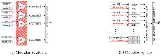 Figure 2b and Figure 5 show that the polynomial square and multiplier produce output in bits. Therefore, a modular reduction is mandated to generate a polynomial of length m bits. For , we implemented a polynomial reduction algorithm of 2.42 of [3], which requires shift and exclusive-(OR) operations for implementation.