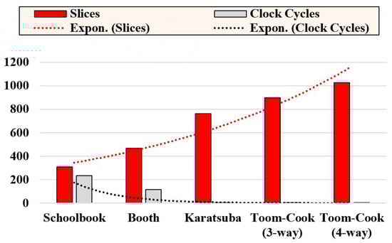 Selection of an appropriate modular multiplier: The modular multiplication operation has significant importance for modular addition and square operations. There are several state-of-the-art polynomial multiplication techniques. Amongst them, the most frequently utilized methods are bit-serial, bit-parallel, digit-serial, and digit-parallel multipliers. Some hardware architectures of these multiplication approaches are reviewed in [32]. Examples of bit-serial multipliers are the schoolbook and booth. Similarly, Karatsuba and Toom–Cook are examples of bit-parallel multipliers. The implementation results of some of these methods are summarized in Figure 3.