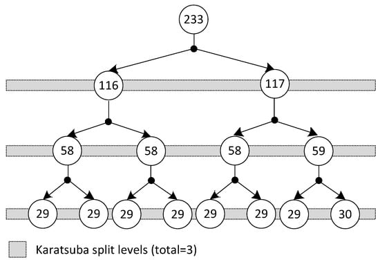 Architecture of our implemented Karatsuba modular multiplier: The Karatsuba multiplier is an efficient way to multiply two polynomials, and it reduces the number of required multiplication operations by splitting a large polynomial’s length into smaller ones. It recursively applies the algorithm to each pair of smaller polynomials and combines the results to obtain the final product. For our implemented Karatsuba multiplier over , each polynomial length is 233 bits, and the polynomial partitions are shown in Figure 4. The gray horizontal bars in Figure 4 show the polynomial splits, and a numerical value inside each circle shows the polynomial size. It is essential to note that it is common in the literature for specific FPGA devices to split Karatsuba polynomials into four levels. After that, the multiplication over smaller split polynomials can be computed using built-in FPGA multipliers. This approach is not compatible with ASIC platforms. Moreover, concerning [33], more polynomial splits result in increased requirement for hardware resources. Therefore, we preferred three polynomial splits in our implemented Karatsuba multiplier, as our implemented multiplier can be used for both FPGA and ASIC platforms. The mathematical background of the Karatsuba multiplier is not presented here; however, interested readers are referred to [12,33] for algorithmic details.